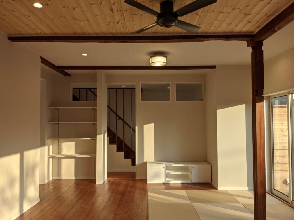 リビングの壁は漆喰仕上げ天井は柳杉の羽目板、畳コーナーも。