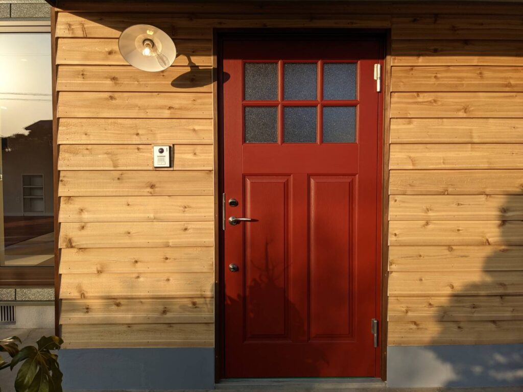 玄関ドアは木質系フェイズドアを採用!カラーはノルディックレッド!!存在感がありますね(^^♪