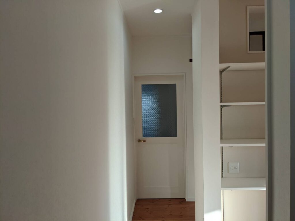 ホワイトのガラスドア。こちらは寸法の兼ね合いから建具屋さんによる製作ドア。