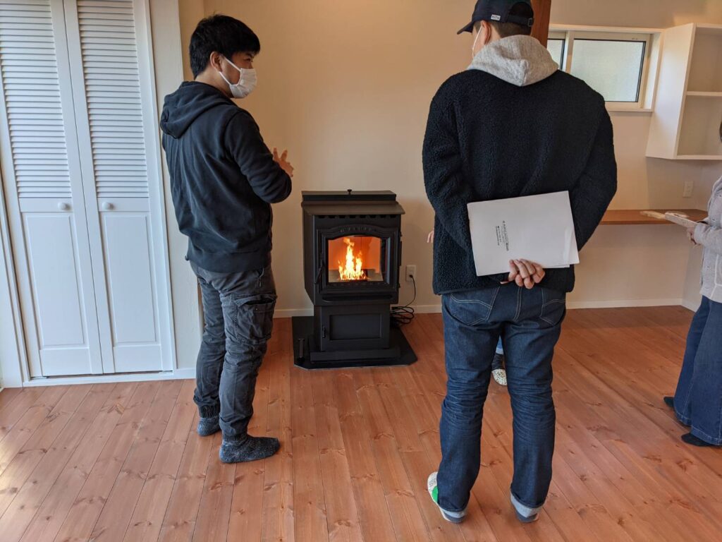ペレットストーブの点火試験風景。メーカーさんによる器具説明もしっかり行います!