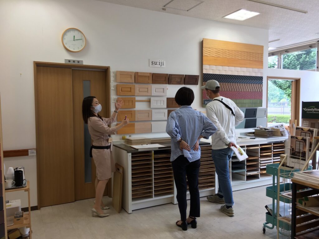 WOODONEさんショールームにて、お打合せ風景。カタログではわからない部分もあるので、実際に確認に行きます。